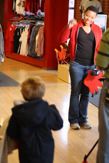 On to the store. Inside, Connor found the local Fox2 reporter doing interviews. He seemed a bit startled when she said hello to him, so he backed up in search of Rally Squirrel.